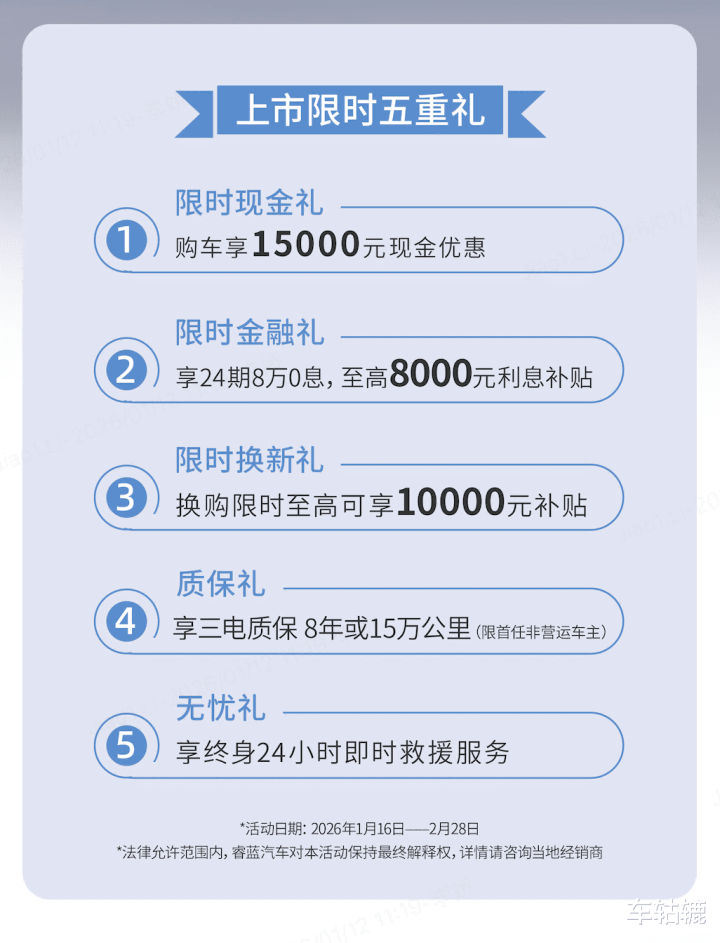 目前,睿蓝8·2026款延续极具竞争力的市场定价12.78万元起,上市限时价格仅需11.28万元起(该价格为指导价减去上市限时现金礼的价格),至高3.3万的限时购车政策同步加码,五大焕新上市限时礼给到用户:1.限时现金礼:现金优惠高达15000元;2.限时金融礼:享24期8万0息,至高8000元利息补贴;3.限时焕新礼:换购至高可享10000元补贴;4.限时质保礼:享三电质保8年或15万公里(限首任非运营车主);4.限时无忧礼:享终身24小时即时救援服务。这波福利力求以“一步到位”的产品力与诚意,助力务实派用户轻松拥抱高品质纯电出行。